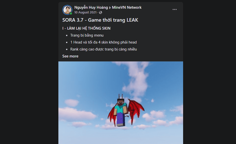 À quên giới thiệu, mình trước là admin của Sorasky - một server con của MineVN. Nghe tên là thấy uy tín rồi phải không nào. Ngoài ra trước đó mình cũng từng là admin của AEMine, và Mine108. Thêm nữa, một số plugin của mình cũng được sử dụng trong các server lớn như MineHot, Grassmine, MinePK,...