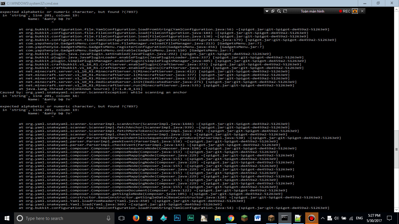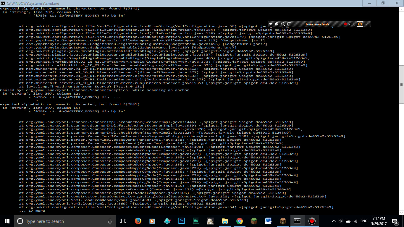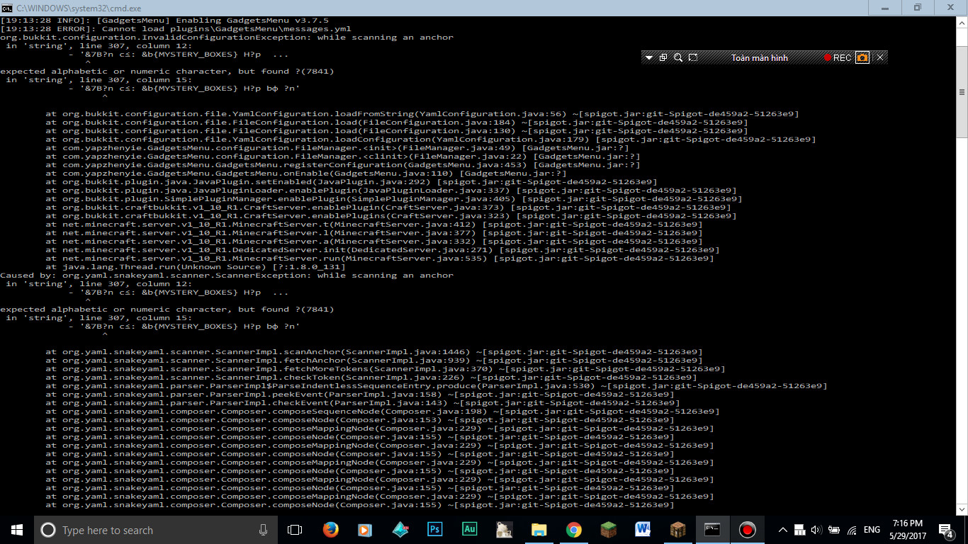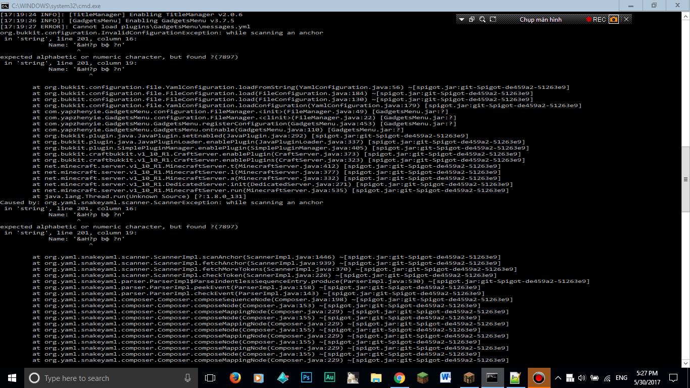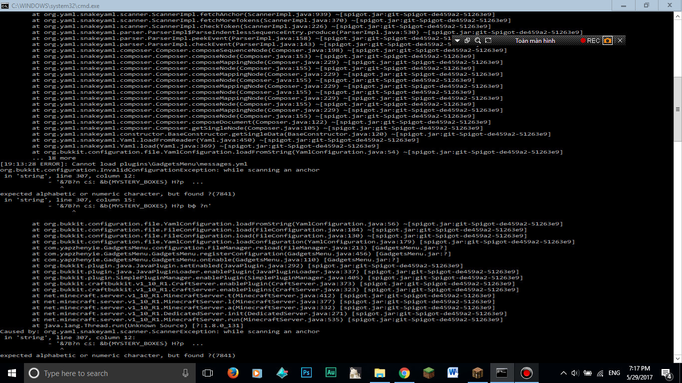 Như tiêu đề, khi mình chạy server thì nó hiện ra lỗi ko thể chạy message.yml và nó hiện ra nguyên dòng lỗi. Dữ liệu mình config trog message.yml cũng mất luôn. Ai biết thì chỉ mình cách fix với . Hình lỗi đây :