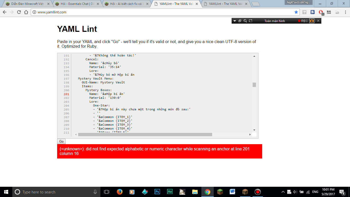 vậy thì chụp cho mình phần Console chứ đừng chụp ảnh kiaMình đã chạy thử sv mà nó báo lỗi ở dòng 201 cột 16 giống như mình check trên yamllint