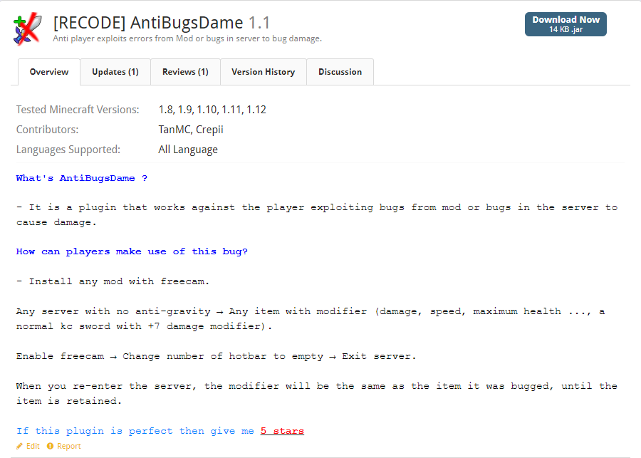 - Em vô tình lướt qua spigotmc và nhìn thấy plugins [RECODE] AntiBugsDame của bạn này!