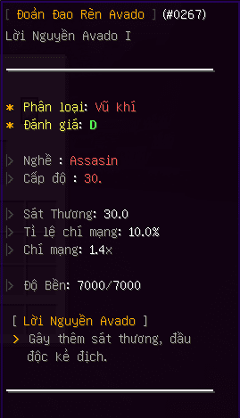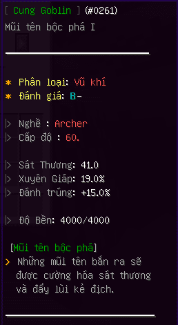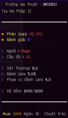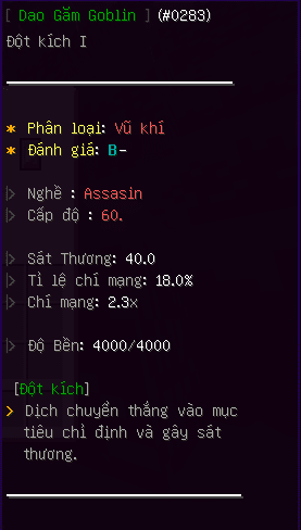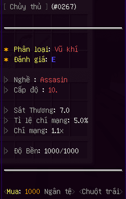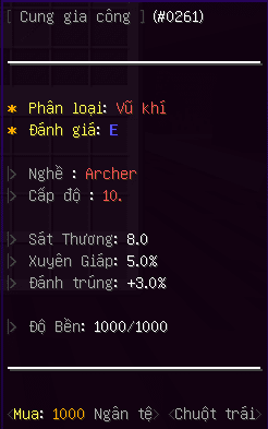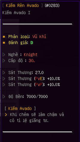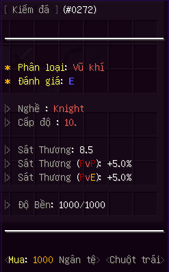 Hệ thống vũ khí xếp theo cấp bậc: F -> S dành cho 4 class: Knight, Assasin, Archer và Mage (Riêng Mage thì vũ khí có skill kiểu đánh thường sẽ bắn ra tia ma pháp về trước(cho nó thật hơn)