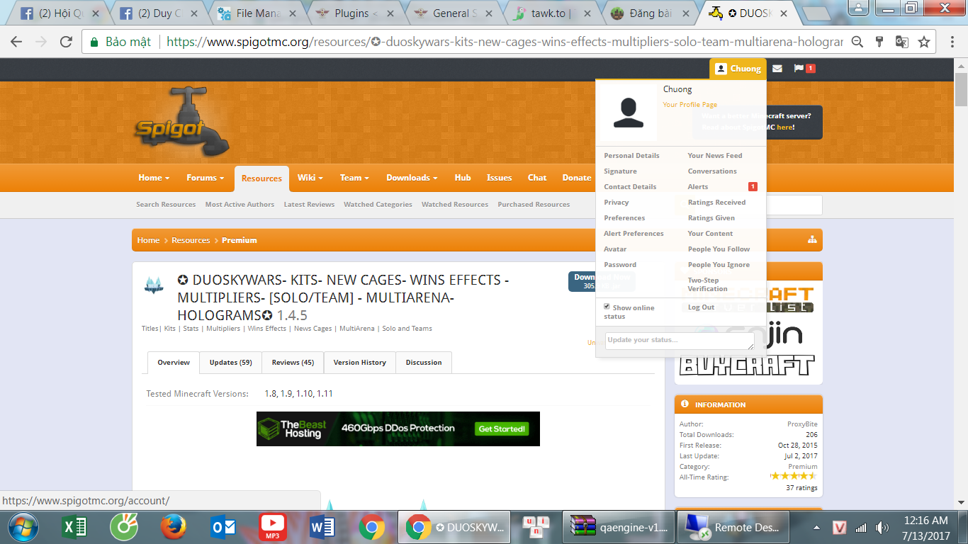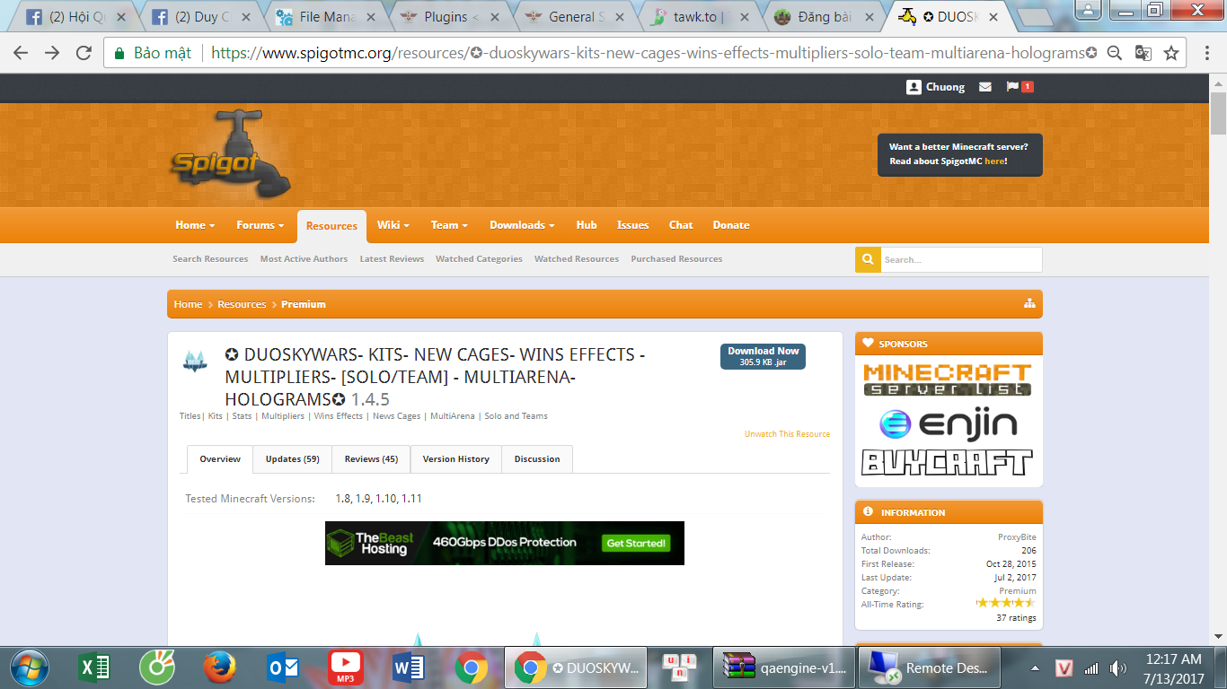 DuoSkywar là 1 plugin skywar mới được cải tiến từ Biteskywar ( 1 plugin skywar mà hypixel từng dùng ) với nhiều chức năng mới, dể cài đặt, cho phép chỉnh solo hoặc team mode chỉ với vài lệnh. Tuy nhiên plugin này hơi khó config, mình là dân mới vào nghề không quen sử dụng nên ko xài được dẫn tới hay bị lỗi, lỡ mua rồi nên giờ muốn thanh lý lại cho các cao thủ config xài. Giá bán trên spigot là 10$ nay mình để lại với giá 100k VNĐ, chỉ bán cho 3 người đầu tiên để lấy lại vốn thôi. Inbox với mình nêu có nhả ý mún mua. Về uy tính thì các bạn cứ yên tâm,vì mình đã mua nó trên spigot việc mình download về rồi bán lại là hoàn toàn miễn phí nên mình ko có lý do gì để lừa đảo ở đây, mình sẽ để hình để chứng minh
