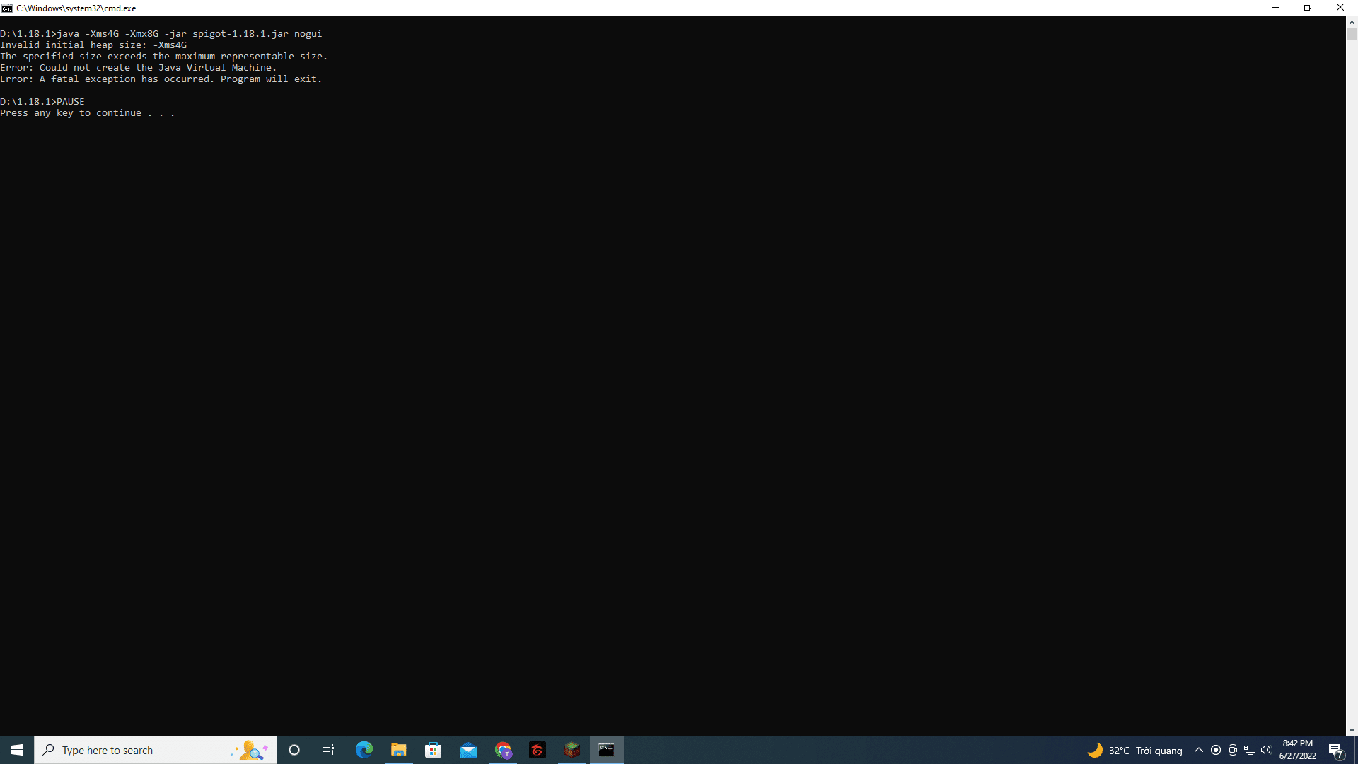 cấu hình máy đây ạvấn đề ở -Xms4G, bạn sét đúng ram cho máy k ? show cái cấu hình đi (nếu như bạn k bik mấy mik bao nhiu ram)