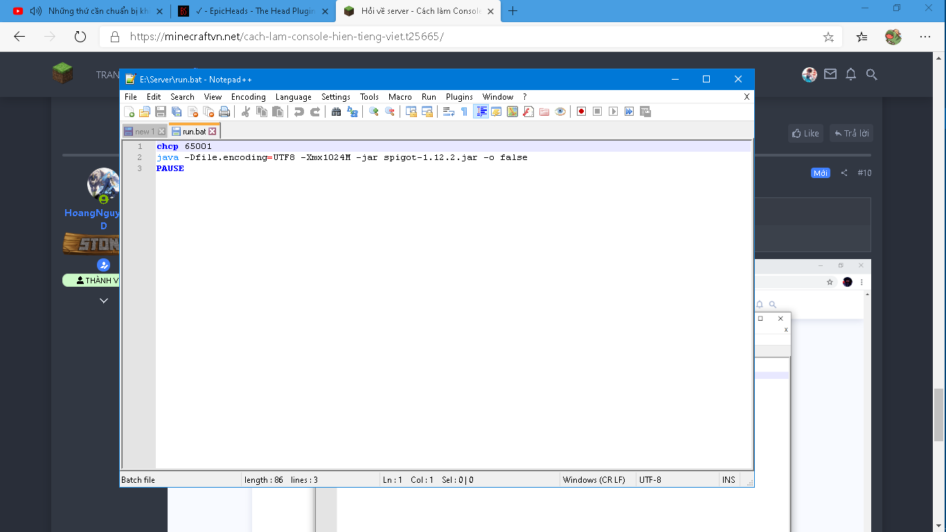 Nếu phiên bản của server dưới 1.12 (bởi vì từ 1.12 trở lên không dùng tiếng Việt được nữa), thì mở file .bat lên và thêm dòng này ở trên cùng của file CHCP 65001