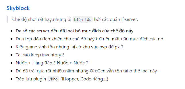 Này là người ta "điểm tên" những gì có thể bị lạm dụng trong mode này, nếu bạn áp dụng hợp lí, mem vui, admin có tiền thì nó chẳng sao cả.cho mình hỏi một chút là với chế độ Skyblock là chế độ sinh tồn trên các đảo khác biệt, vậy giả sử nếu member muốn pk thì mình có nên kết hợp vào KOTH hay cho phép pvp ở khu vực boss, dungeon không.?!