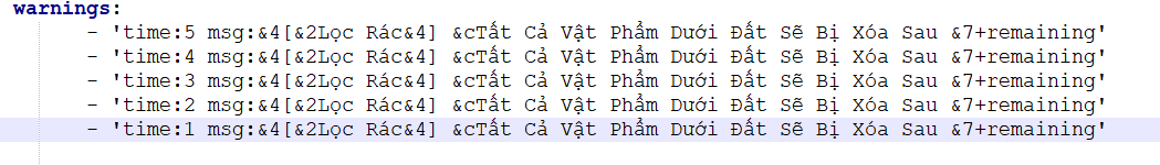 - 'time:599 msg:&cRác sẽ được dọn dẹp sau &e+remaining &cgiây!' (tức là sẽ dọn dẹp rác sau 1 giây)