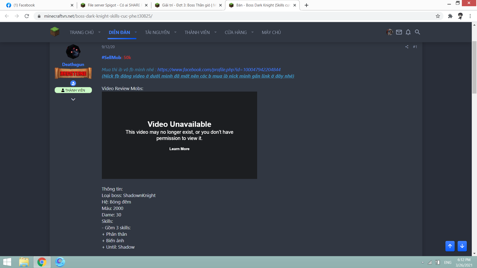 #SellMob: 50k Mua thì ib vô fb mình nhé : https://www.facebook.com/profile.php?id=100047942204844 {Nick fb đăng video ở dưới mình đã mất nên các b mua ib nick mình gắn link ở đây nhé} Video Review Mobs: Thông tin: Loại boss: ShadownKnight Hệ: Bóng đêm Máu: 2000 Dame: 30 Skills: - Gồm 3...minevn.net