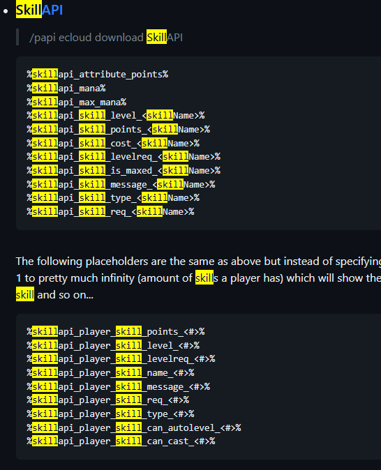 Cảm ơn bạn cái đó thì mình biết, nhưng api của cái đó không có phần hiện level class nên mình mới cài thêm skillapiplaceholder nhưng add vào không được ấy ạbạn có thể tham khảo, theo mình nghĩ placeholder bạn dùng cho skillapi chưa đúng