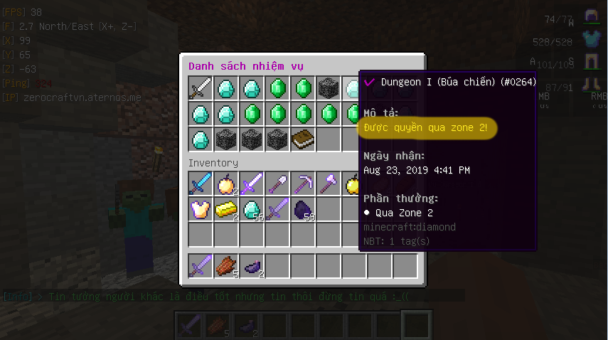 2. Tạo Nhiệm vụ / thành tựu về giết quái trong dungeon > phần thưởng: permission
