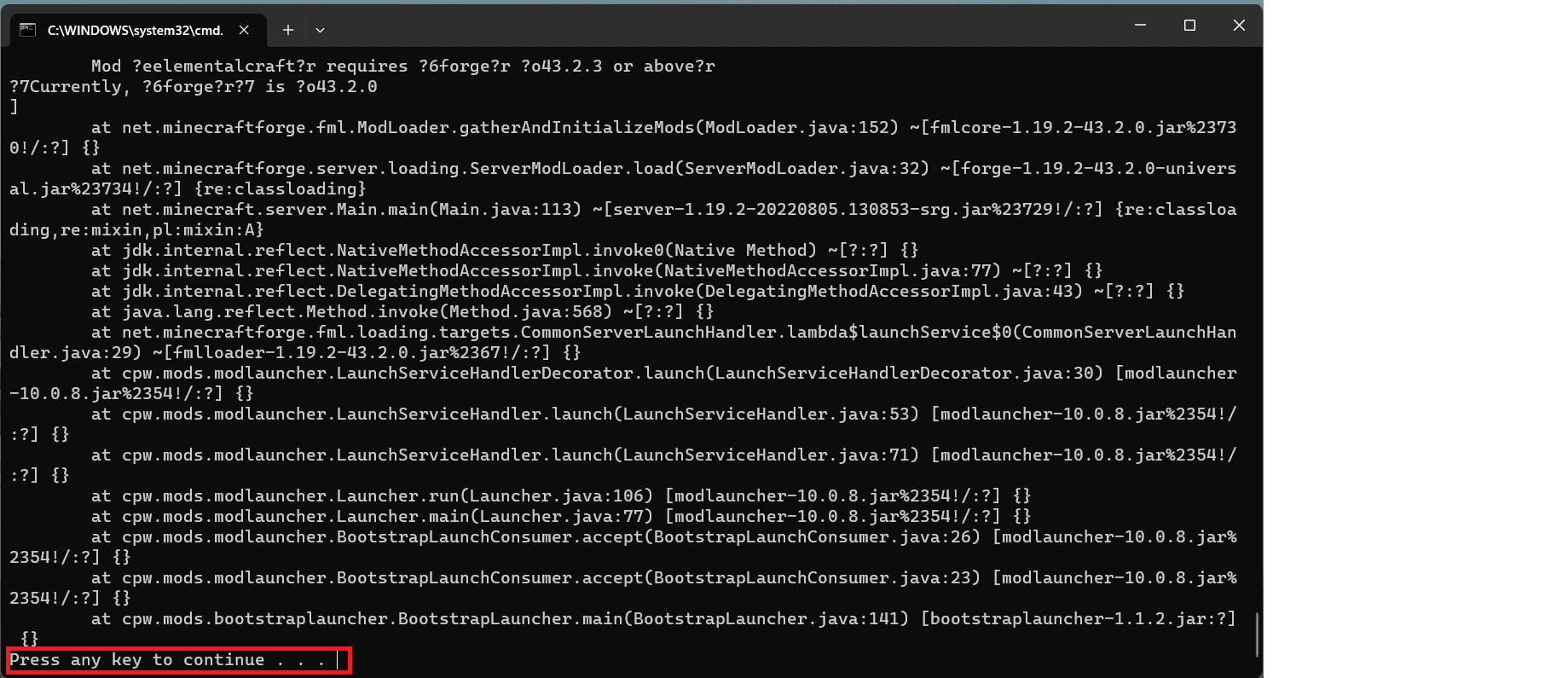 Hỏi về server giúp mình khắc phục Lỗi Press any key to continue . . . khi tạo sv bằng forge với!!!