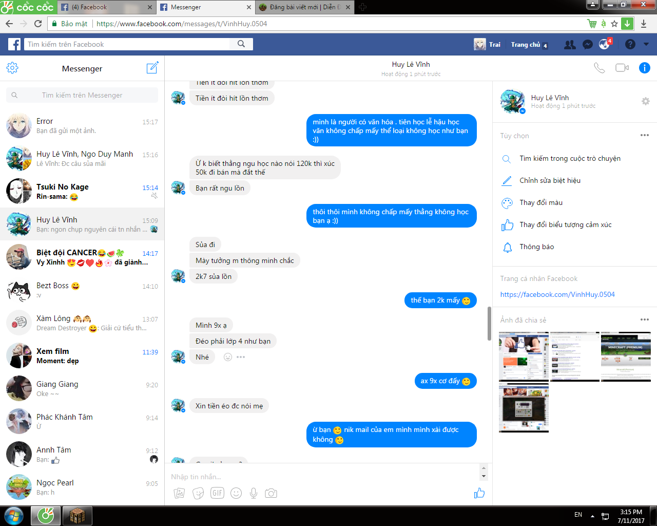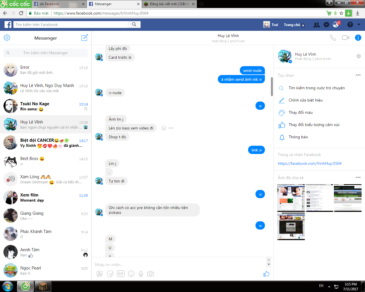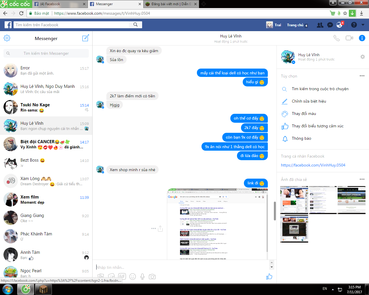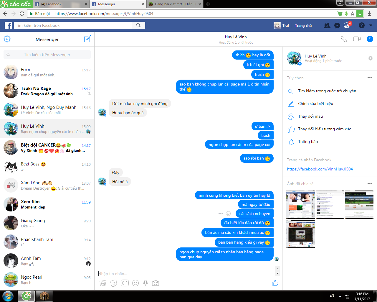 kêu show tin nhắn page đell chịu show,rồi còn dọa cho page ác nacker các kiểu . Nói chung bạn ấy là một thằng nhóc vô học , vô văn hóa đi lừa đảo , 1 thằng cố chấp . Xem ảnh để biết thêm thông tin , à mà bác nào rảnh rảnh ib chửi nó giúp cái , nchuyen với mấy cái loại này max ức chế ; tiện cho nik nó 1 vé lên trời .