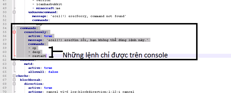 tìm phần commands: xuống consoleonly trong config.yml : (Như ảnh)