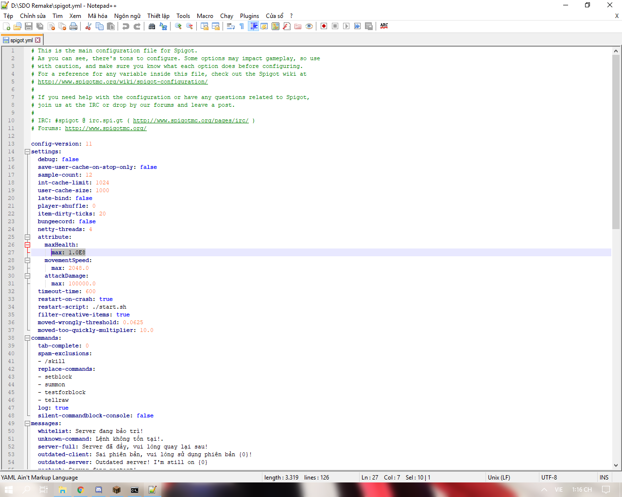 Mở spigot.yml lên set dòng maxHeath thành con số tùy ý, nó sẽ là mức max health cho tất cả player với mobs