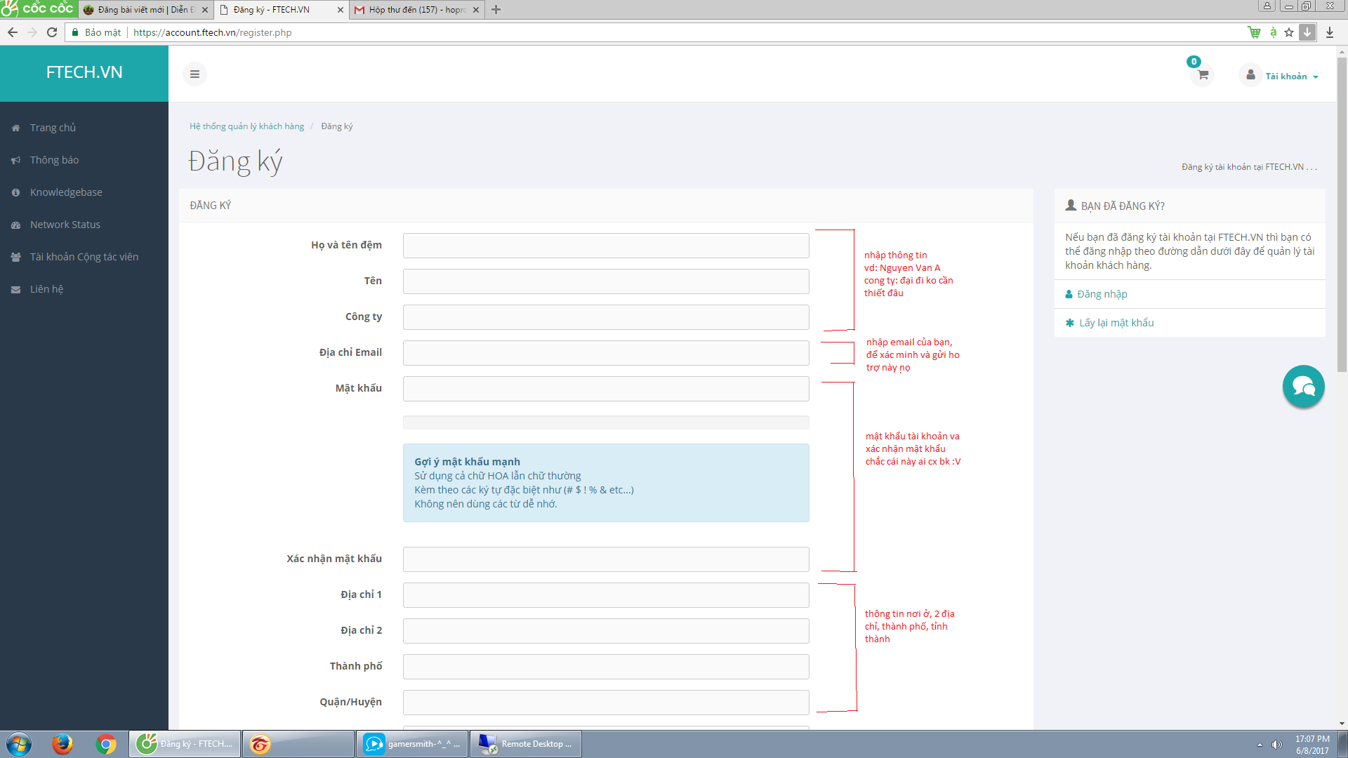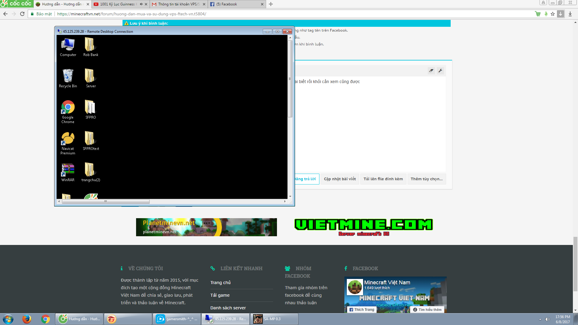 ờ thì 2 cái đầu là điền tên server nếu đã có doumain [không có thì điền đại cũng không sao], mật khẩu thì điền mật khẩu lúc đăng nhập vào ftech, 2 cái cuối là user để quản lí VPS, vậy thôi!!! =))
