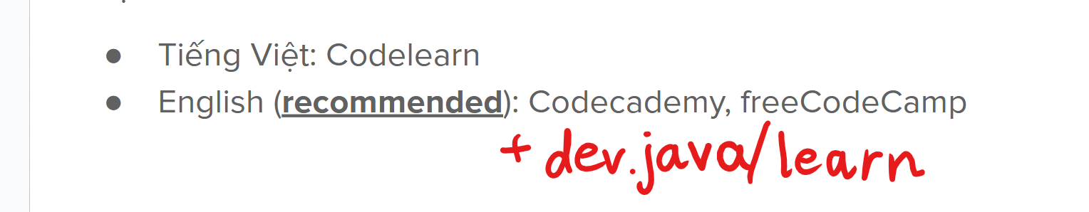 - Gợi ý chỗ học Java: CodeLearn (tiếng Việt); freeCodeCamp/Codecademy (English), dev.java