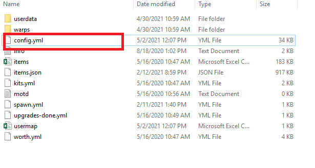 3. Tắt máy chủ và vào thư mục plugin Essentials tìm config