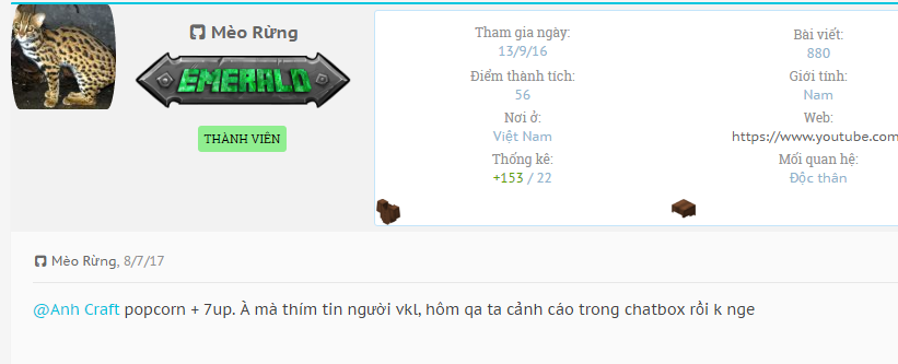 Như tiêu đề, mình thấy forum càng ngày càng đi xuống. Lúc mới vào forum này mình thấy rất nhiều câu hỏi, nhưng đại khái là hỏi nghiêm túc và khó, nên mình cũng cmt và giúp mấy bạn đó. Nhiều plugins hay và bổ ích do các Developers Share. Nhưng ngày nay MINECRAFTVN.NET càng ngày càng xuống dóc, nhiều vụ phốt trong khi lúc trước kiếm 1 cái kh có