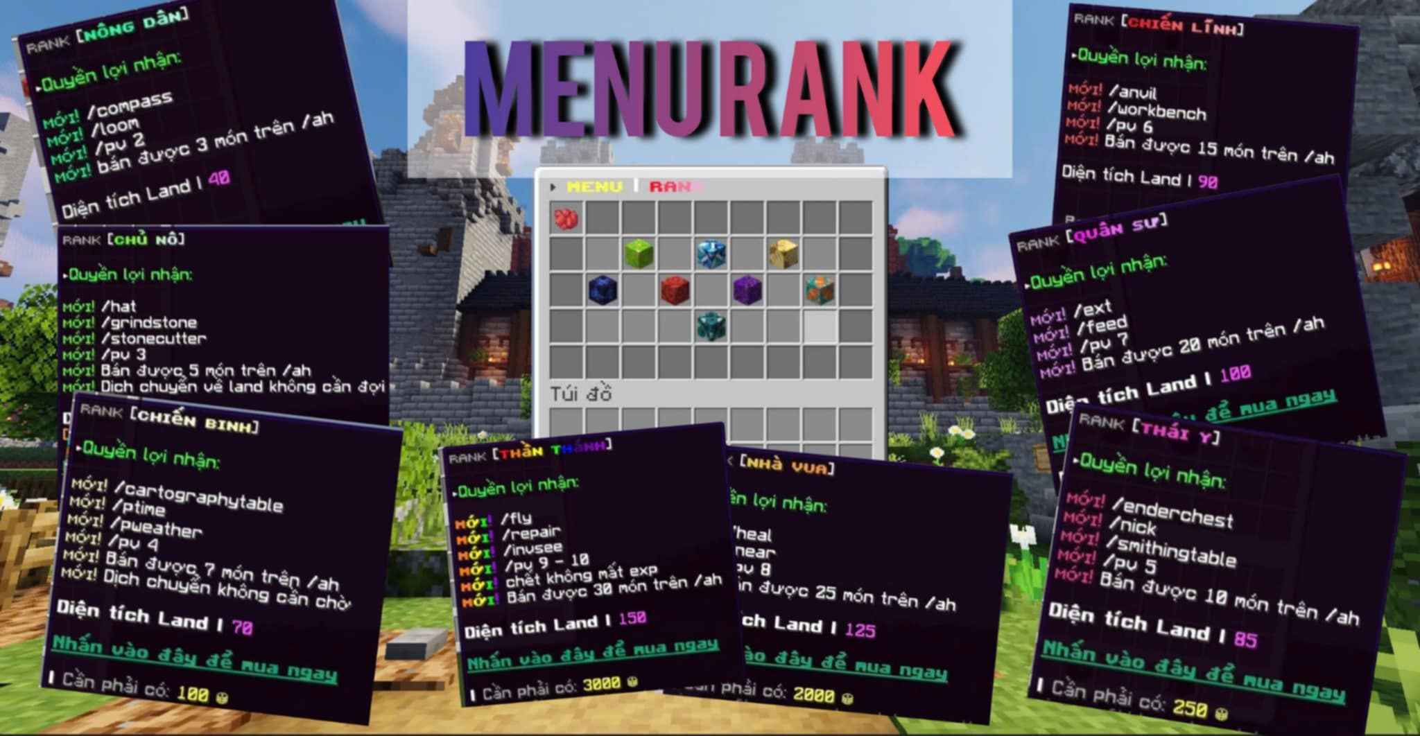 » /rank để mở bảng mua cấp bậc, có thể mua từ Money và Coin