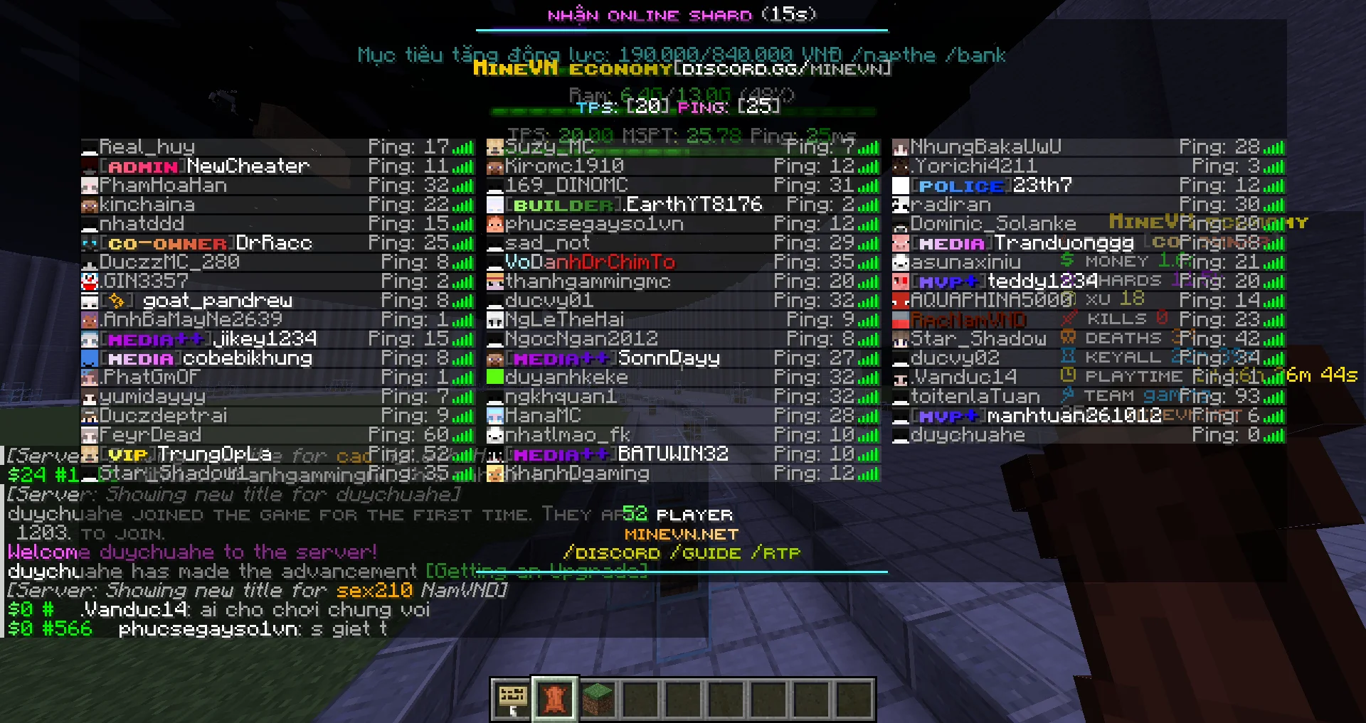 MineVN Economy là một ecoSMP mới mở với các chức năng chưa từng thấy ở Việt Nam như casino đen đỏ, duel đấu tay đôi cân bằng, warp flat độc quyền, hệ thống FFMAXv10 đảm bảo cân bằng người chơi... Hãy vào ngay tại