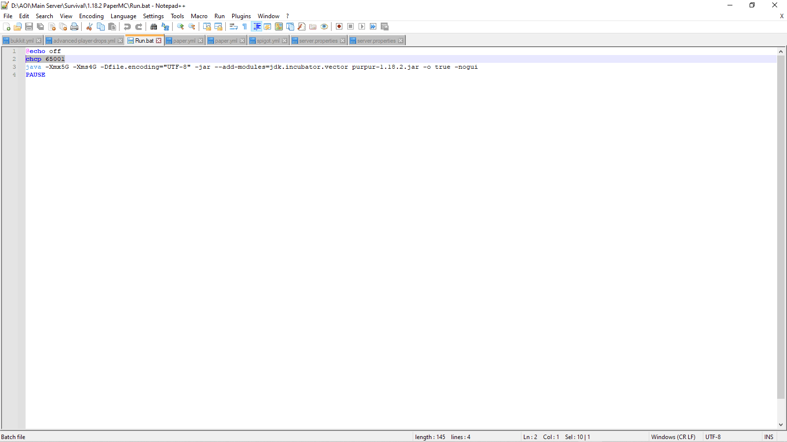 java -Xms8G -Xmx8G -Dfile.encoding=UTF-8 -XX:+UseG1GC -XX:+ParallelRefProcEnabled -XX:MaxGCPauseMillis=200 -XX:+UnlockExperimentalVMOptions -XX:+DisableExplicitGC -XX:+AlwaysPreTouch -XX:G1NewSizePercent=30 -XX:G1MaxNewSizePercent=40 -XX:G1HeapRegionSize=8M -XX:G1ReservePercent=20 -XX:G1HeapWastePercent=5 -XX:G1MixedGCCountTarget=4 -XX:InitiatingHeapOccupancyPercent=15 -XX:G1MixedGCLiveThresholdPercent=90 -XX:G1RSetUpdatingPauseTimePercent=5 -XX:SurvivorRatio=32 -XX:+PerfDisableSharedMem -XX:MaxTenuringThreshold=1 -XX:+UseLargePagesInMetaspace -Dusing.aikars.flags=mcflags.emc.gs -Daikars.new.flags=true -jar paper.jar nogui