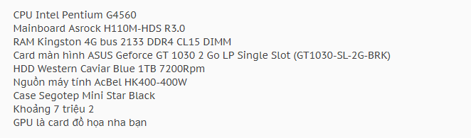 Card đồ họa: ko muốn mua nividia,card nào nhẹ nhẹ thôi,1080p là đủ hoặc 1 con AMD nhẹ nhẹ