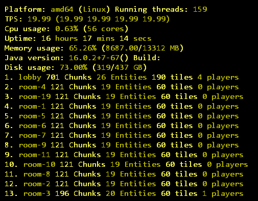 Server mình (đây là đại sảnh) với 13 world đã ăn tới 8.6GB (các room cực kì nhỏ, sử dụng schematic paste)