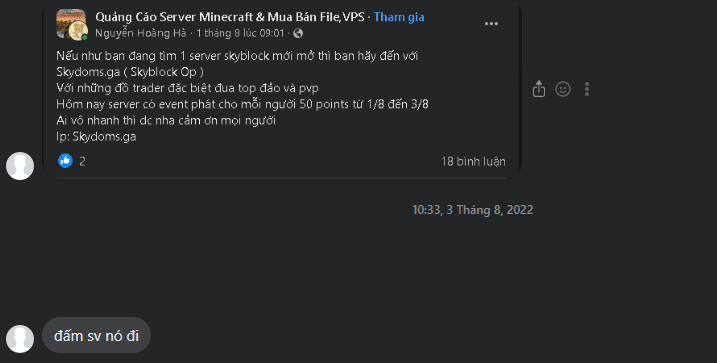 , nay lên vạch mặt nó ra cho ae xemThứ nhất th nhóc này hồi còn ở sky2 đảo cỏ , mình có được em mình bảo vào chơi xong cũng nt qua với nó rồi ib lên fb , nó có xin mình làm sv. Và mình oke , ban đầu chỉ định cho nó làm configer thôi , sau này bắt đầu thân lên thì mình mời nó làm owner cùng luôn , nhưng th ngu này nó cứ tưởng nó hay , plugin thì toàn xin còn kêu mình đi mua , xin về cho nó sài ?