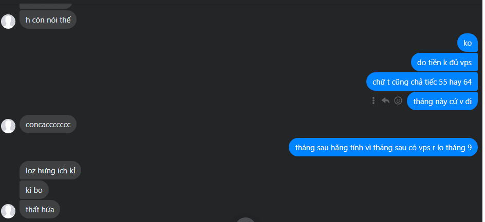 Việc mình 0 làm gì , do lúc nào bảo để vps t làm thì cứ bảo t đang bận ? đêm đéo ai rảnh mà on làm đc