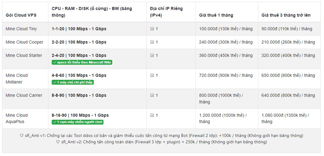 Bảng giá VPS VIỆT NAM chuyên server Minecraft